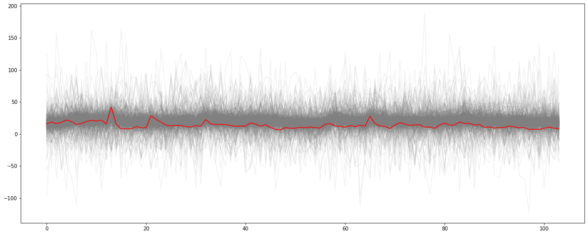 with mmm1: prior_pred = pm3.sample_prior_predictive()prior_names = [prior_name for prior_name inlist(prior_pred.keys()) if (prior_name.endswith("logodds__") ==False) & (prior_name.endswith("_log__") ==False)]fig, ax = plt.subplots(figsize = (20, 8))_ = ax.plot(prior_pred["sales"].T, color ="0.5", alpha =0.1)_ = ax.plot(y_transformed.values, color ="red")