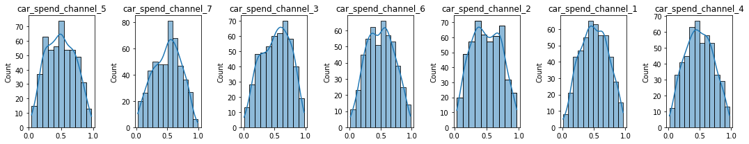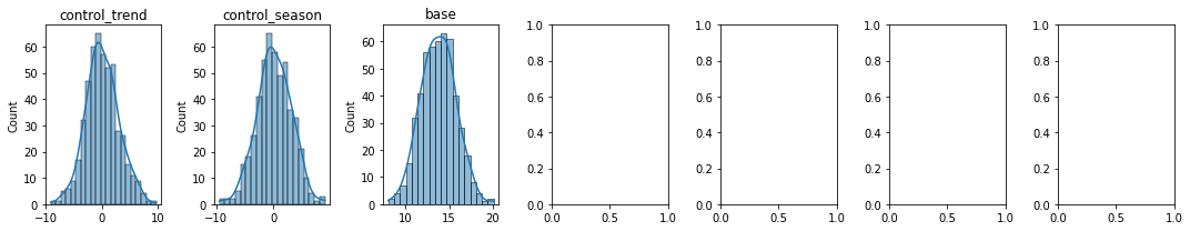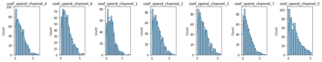 #plots priors using the random variablesdef plot_priors(variables, prior_dictionary =None):ifisinstance(variables[0], pm3.model.TransformedRV) ==Falseand prior_dictionary isNone:raiseException("prior dictionary should be provided. It can be generated by sample_prior_predictive") cols =7 rows =int(math.ceil(len(variables)/cols)) fig, ax = plt.subplots(rows, cols, figsize=(15, 3*rows)) ax = np.reshape(ax, (-1, cols))for i inrange(rows):for j inrange(cols): vi = i*cols + jif vi <len(variables): var = variables[vi]ifisinstance(var, pm3.model.TransformedRV): sns.histplot(var.random(size=10000).flatten(), kde=True, ax=ax[i, j])#p.set_axis_labels(var.name) ax[i, j].set_title(var.name)else: prior = prior_dictionary[var] sns.histplot(prior, kde=True, ax = ax[i, j]) ax[i, j].set_title(var) plt.tight_layout()adstock_priors = [p for p in prior_names if p.startswith("car")]plot_priors(adstock_priors, prior_pred)print(f"carryover priors: {len(adstock_priors)}")# alpha_priors = [p for p in prior_names if p.startswith("sat")]# plot_priors(alpha_priors, prior_pred)# print(f"sat priors: {len(alpha_priors)}")media_coef_priors = [p for p in prior_names if p.startswith("coef")]plot_priors(media_coef_priors, prior_pred)print(f"coef priors: {len(media_coef_priors)}")control_coef_priors = [p for p in prior_names if p.startswith("control_")] + ["base"]plot_priors(control_coef_priors, prior_pred)print(f"control coef priors: {len(control_coef_priors)}")#plot_priors(["sigma"], prior_pred)print(f"sigma prior: 1")