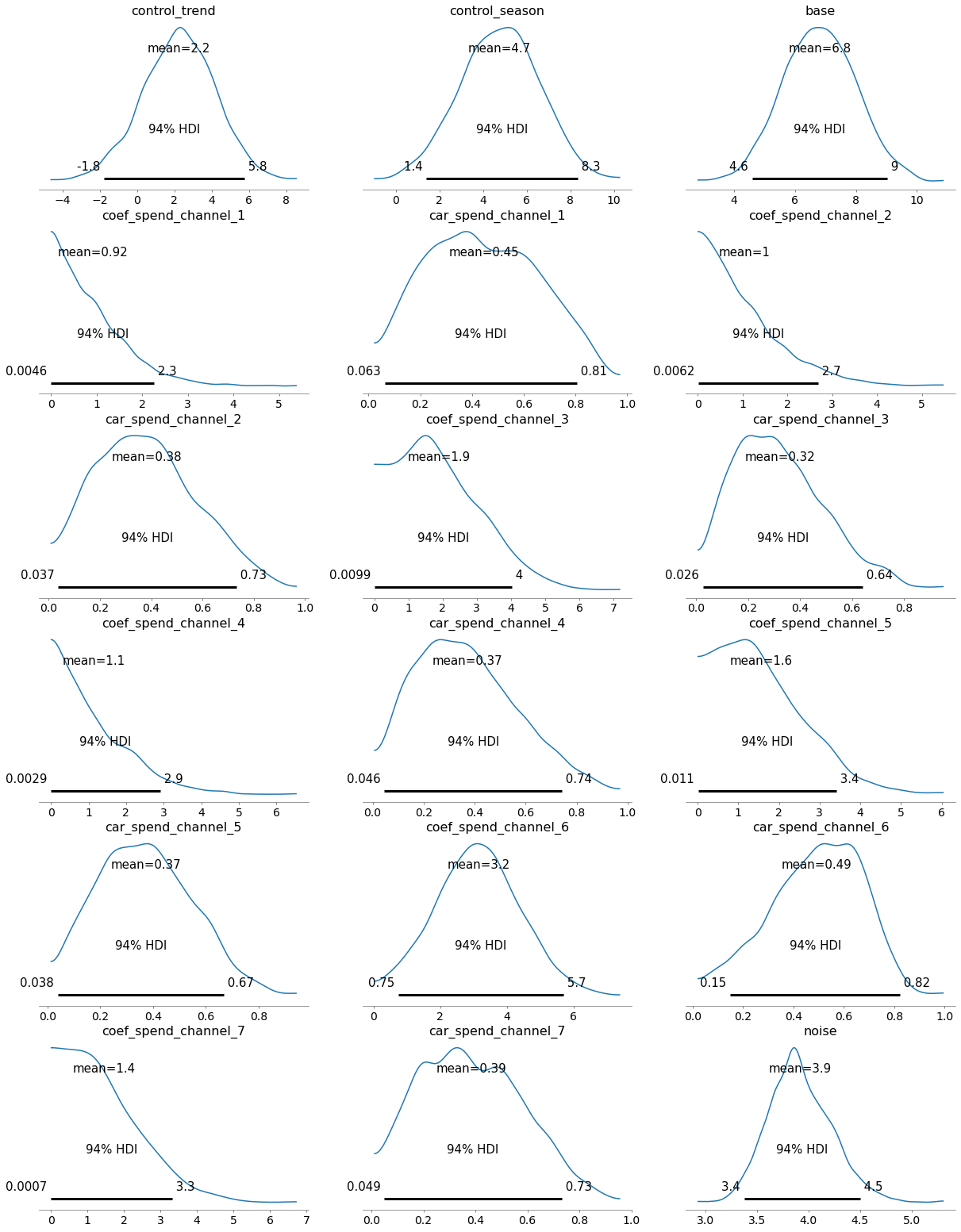control_variables = ["trend", "season"]delay_channels = [f'spend_channel_{i}'for i inrange(1,8)]transform_variables = control_variables+delay_channelsy_transformed=y/10000#rescale target variableX_transformed = X.copy() #Min-max scale the featuresnumerical_encoder_dict = {}for feature in transform_variables: scaler = MinMaxScaler() original = final_data[feature].values.reshape(-1, 1) transformed = scaler.fit_transform(original) X_transformed[feature] = transformed numerical_encoder_dict[feature] = scalerwith pm3.Model() as mmm1: channel_contributions = []for channel in delay_channels:print(f"Delay channels: Adding {channel}")#Force the channel coefficients to be normal: coef = pm3.HalfNormal(f'coef_{channel}', sigma =2) car = pm3.Beta(f'car_{channel}', alpha=2, beta=2) channel_data = X_transformed[channel].values channel_contribution = pm3.Deterministic(f'contribution_{channel}', coef * carryover( channel_data, car), ) channel_contributions.append(channel_contribution) control_contributions = []for control_var in control_variables:print(f"Control Variables: Adding {control_var}") x = X_transformed[control_var].values control_beta = pm3.Normal(f"control_{control_var}", sigma =3) control_x = control_beta * x control_contributions.append(control_x) base = pm3.Normal("base", np.mean(y_transformed.values), sigma =2)#base = pm3.Exponential('base', lam=0.01) noise = pm3.Exponential('noise', lam=0.1) sales = pm3.Normal('sales', mu= base +sum(control_contributions) +sum(channel_contributions), sigma=noise, observed=y_transformed )